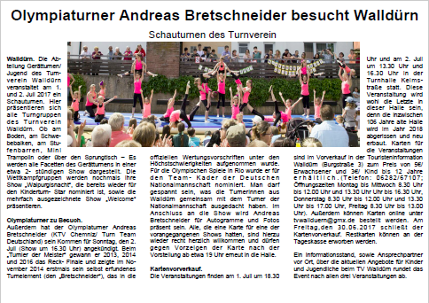 Walldürn. (Sti.) Recht eindrucksvoll dokumentiert wurden im Verlauf der Generalversammlung des TV 1848 Walldürn die vielfältigen Aktivitäten und sportlichen Erfolge im Breiten- und Leistungs-sportbereich durch die Tätigkeits- und Rechenschaftsberichte der Sparten bzw. Abteilungen sowie der ausgelagerten Turnabteilung in Waldstetten des TV 1848 Walldürn, die von den jeweiligen Abtei-lungsleitern vorgetragen wurden. Alle Sparten bzw. Abteilungen hatten wiederum eine durchweg sehr positive Leistungsbilanz aufzu-weisen und wussten jeweils von vielfältigen sportlichen Aktivitäten und Erfolgen auf Vereins-, Kreis-, Gau- und BTB-Ebene zu berichten. mehr...